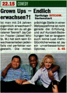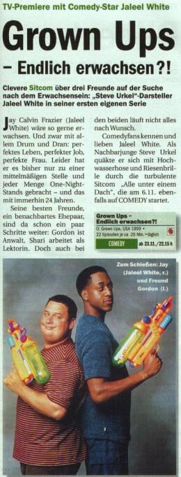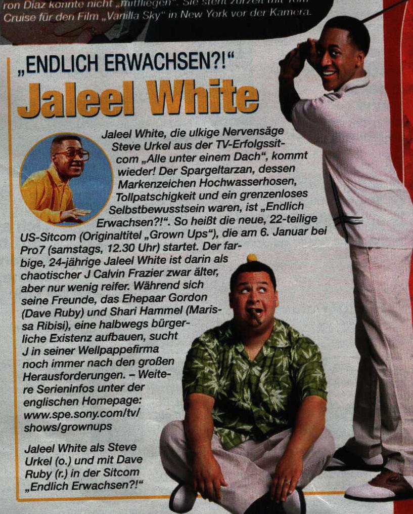 Willkommen auf dieser Webseite für die Sitcom "Grown Ups - Endlich erwachsen?!". Ich habe so viel Material zur Sitcom "Alle unter einem Dach" mit Jaleel White (Urkel) der auch in "Grown Ups" auftritt gesammelt, daß ich mich entschloß diese spezielle Seite zu erstellen. Dazu gibt es zunächst drei deutsche Texte, einmal zum Serienstart in Pro7, und zum anderen einen langen und einen kurzen Text von Premiere World. Die meisten Teile dieser Seite sind dann allerdings in Englisch, dazu gehören Photos , kurze Texte zur Cast, Zeitungsartikel, Episodenführer, Links und es ist auch möglich daß Gästebuch anzusehen oder sich dort einzutragen. Weiterhin könnt Ihr meine Alle unter einem Dach und meine Kellie Williams Fanseiten besuchen. |